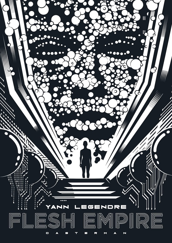 Drôle de bande-dessinée qui tangente le livre de belles images, car il faut le savoir le scénario de cette BD est mince, très mince. On ajoutera à l’écueil de ce scénario anorexique des pages complètes en anglais (un poème de Norman Spinrad, si j’ai bien compris) et un choix de vocabulaire assez peu convaincant, façon novlangue qui part dans le mur. On pourrait rapprocher l’histoire d’une certaine SF de Greg Egan (je pense à La Cité des permutants), mais Yann Legendre même s’il croit sans doute le contraire ne fait pas vraiment de la science-fiction. Flesh Empire est une allégorie un peu boiteuse, où il parle de la société de surveillance, du Big Data et de l’intelligence artificielle, mais tout cela dans le but de célébrer la vie et la chair, davantage que de pousser une réflexion nécessaire pour ne pas dire salutaire. A bien y réfléchir, rien de tout ça ne fonctionne vraiment et la pirouette finale qu’on voit venir de très loin est au mieux embarrassante. Mais, car il y a un mais, le travail graphique est sidérant, certaines images sont purement incroyables. Si Legendre avait réussi à se débarrasser totalement de sa panoplie de références (pour la plupart datées) et avait poussé l’effort jusqu’à nous proposer un monde radicalement différent (rattaché en rien au nôtre), sans doute aurait-il livré une BD sidérante de A à Z (et sa fin aurait eu alors un autre sens). En l’état, c’est loupé.